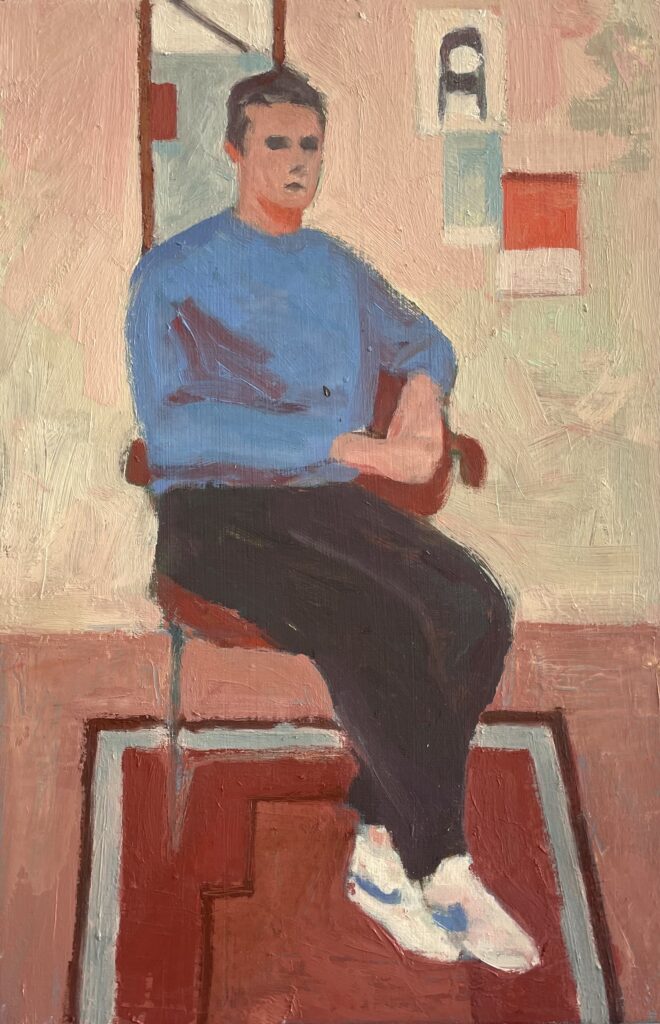 Using colored pencil and gouache for works on paper, and oil on canvas for larger formats, Rosebrugh deliberately leaves visible traces of the process—textures, layers of paint, reserved areas, and pentimenti—markers that anchor his images in a physicality absent in digital work. These choices give his often ordinary subjects—a figure, an interior, a piece of furniture, or a fleeting moment—unexpected depth and a subtly charged atmosphere.